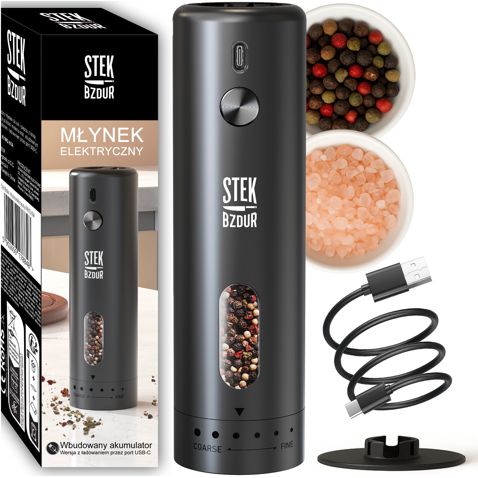 Nowoczesność: Zapomnij o szukaniu baterii „paluszków”. Ten młynek ma wbudowany akumulator ładowany przez popularny port USB-C (kabel w zestawie).