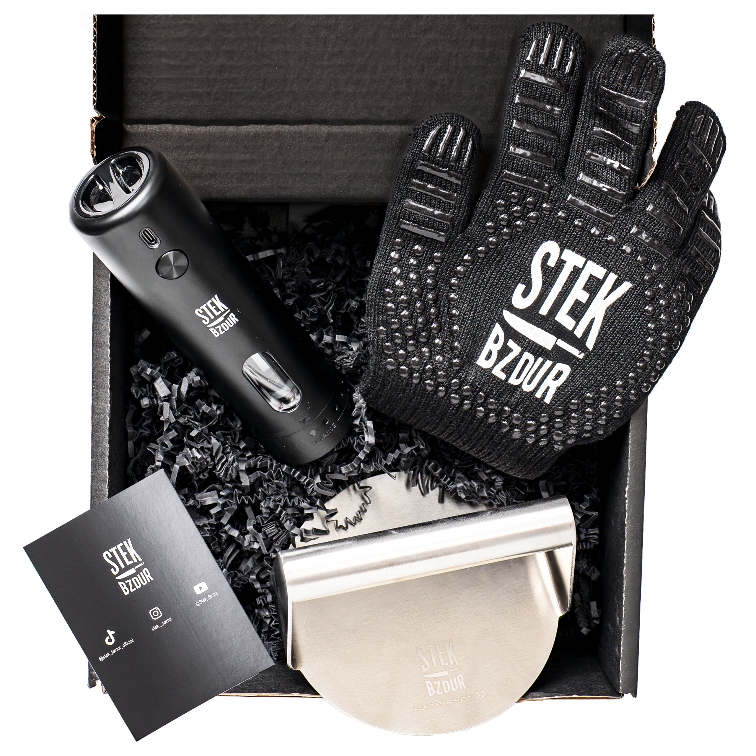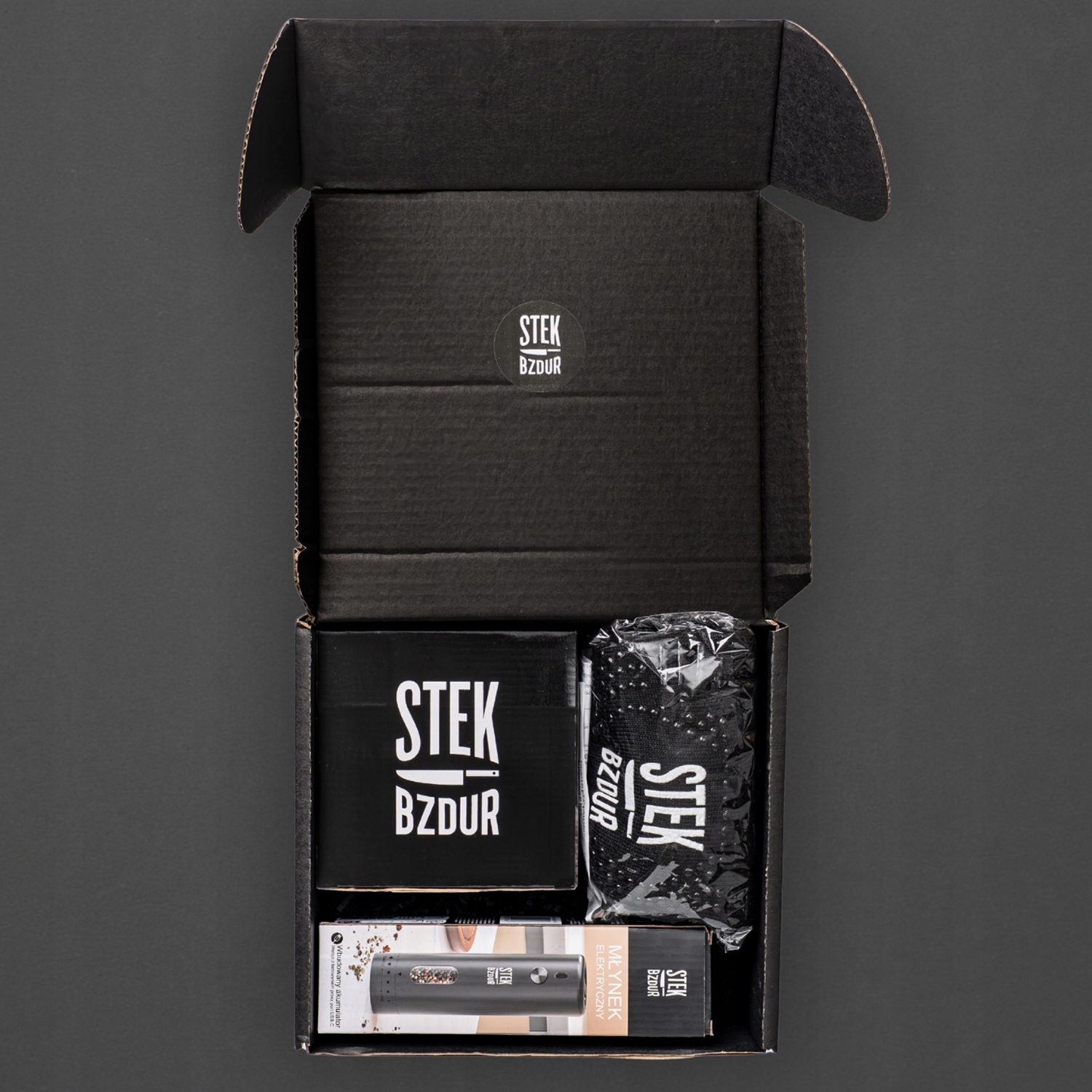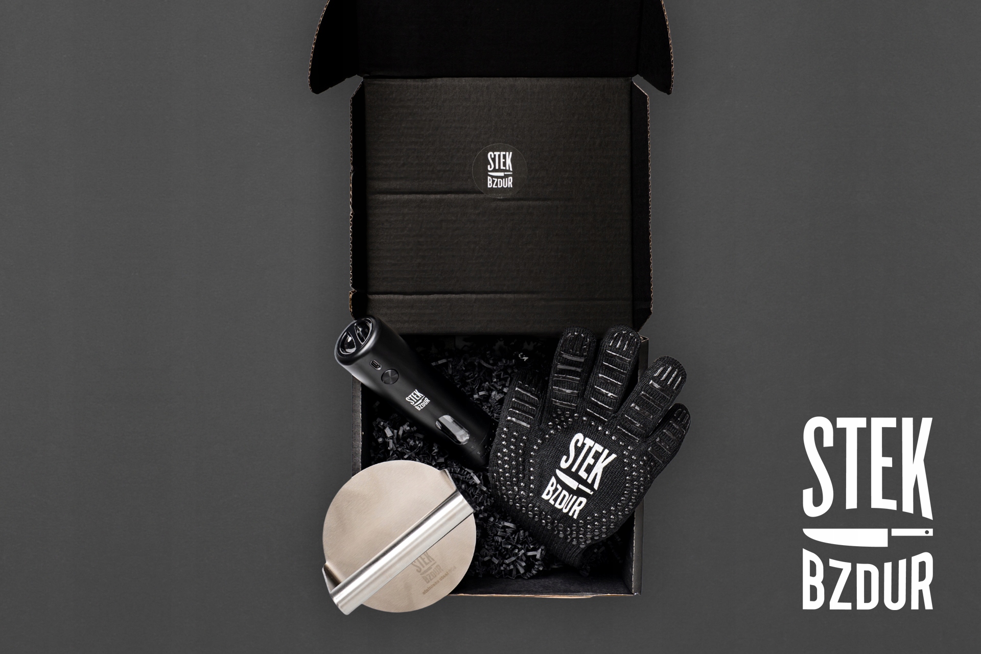 Kupując ten produkt, otrzymujesz duży, elegancki karton z logo „Burger Lover”, wypełniony trzema produktami marki Stek Bzdur. To gotowy prezent, który robi wrażenie wagą i jakością wykonania.